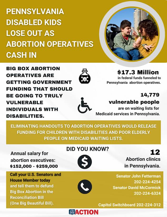 What does this mean for Pennsylvania? It means taxpayer dollars are being funneled to abortion operatives – while almost 15,000 disabled children and vulnerable adults languish on Medicaid waiting lists.